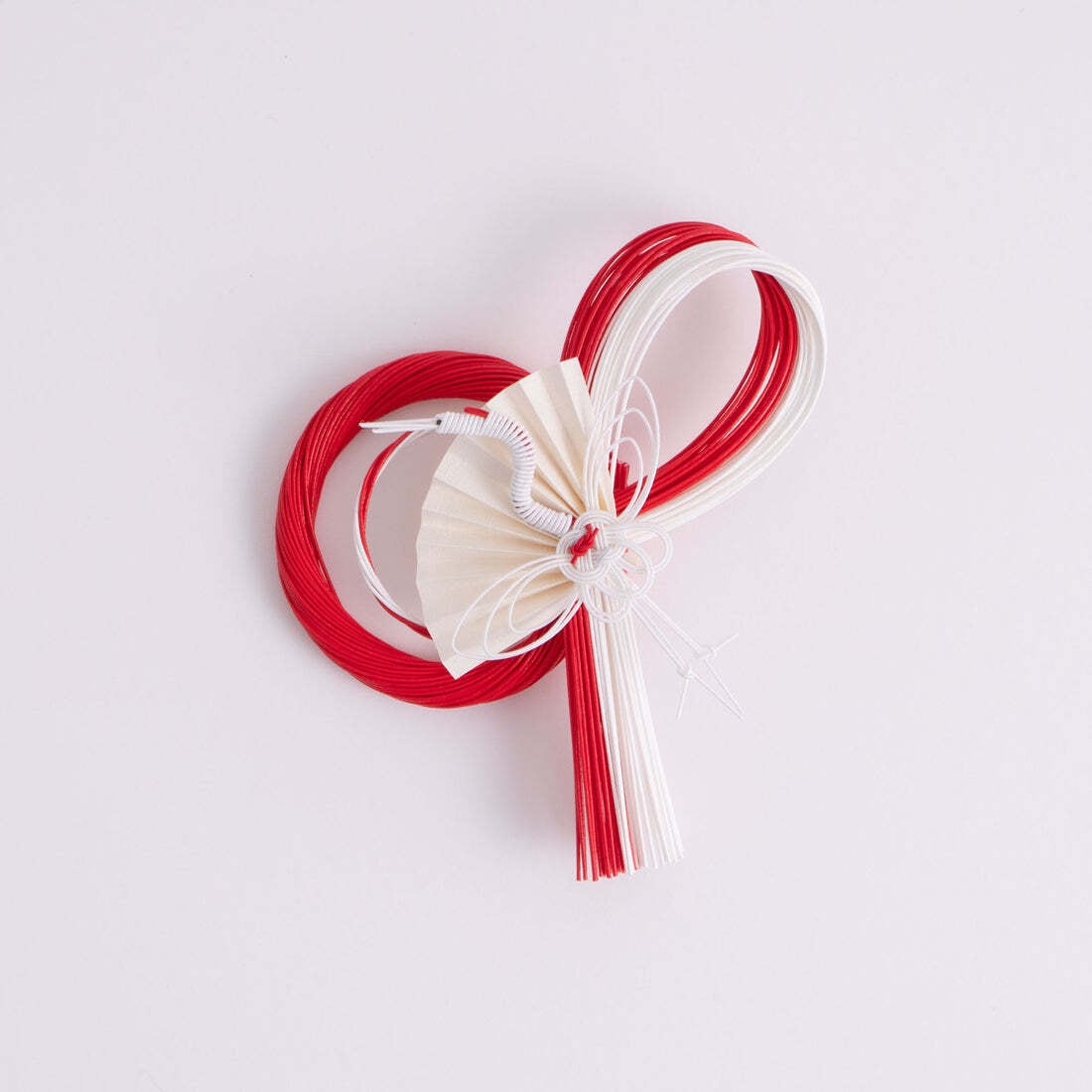 水引きはこより状の紙に水を引いて作られ、無垢で清潔なものという意味があり、水引を結ぶことで人と人、人と神を結ぶ願いが込められています。水引の紅と白のおめでたいデザインのお飾りです。